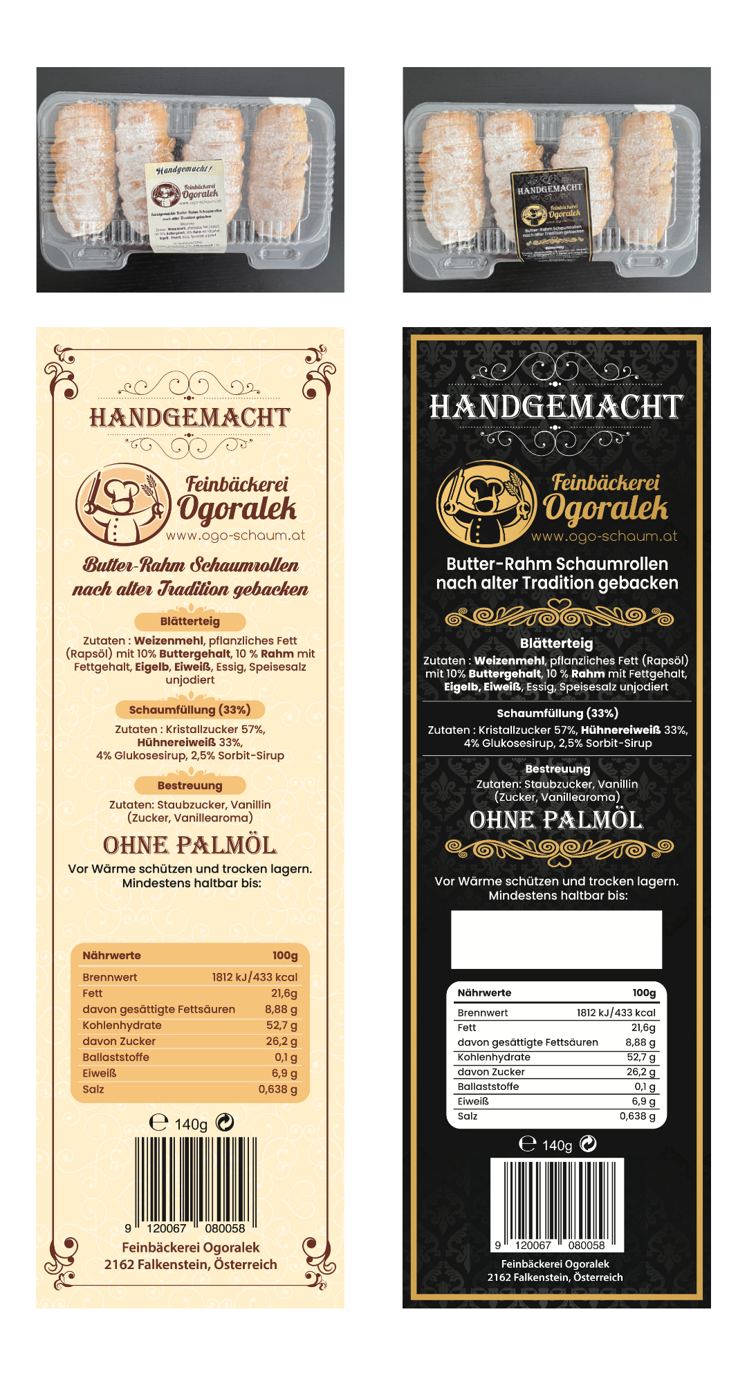 Wir haben uns für ein dunkles, edles Design entschieden. Zum einen verbindet man mit dünkleren Farbnuancen Luxus & Premium, zum anderen ist der Kontrast zu dem hellen Backwarenteig und dem Zucker höher und somit markanter in den Regalen der Einzelhändler.